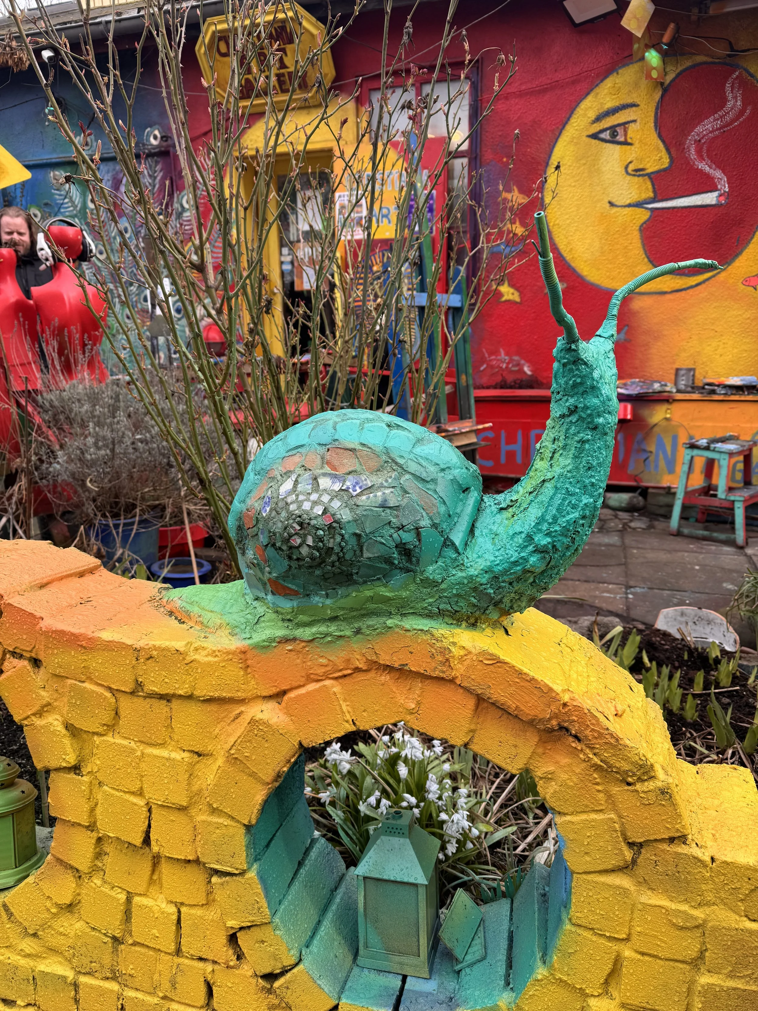 You walk through an entrance in Christianshavn, and the city you've been navigating for two days simply stops. The air changes. The sound changes — more voices, more life, a different quality of noise. The buildings here were not designed. They accumulated. A house covered in mosaics and ceramic snails, a corner turned into a skate ramp, a dark staircase covered in graffiti and stickers leading up to a small gallery selling prints and artists' books. An auction was happening when we arrived, quiet and unhurried, indifferent to the tourists passing through.