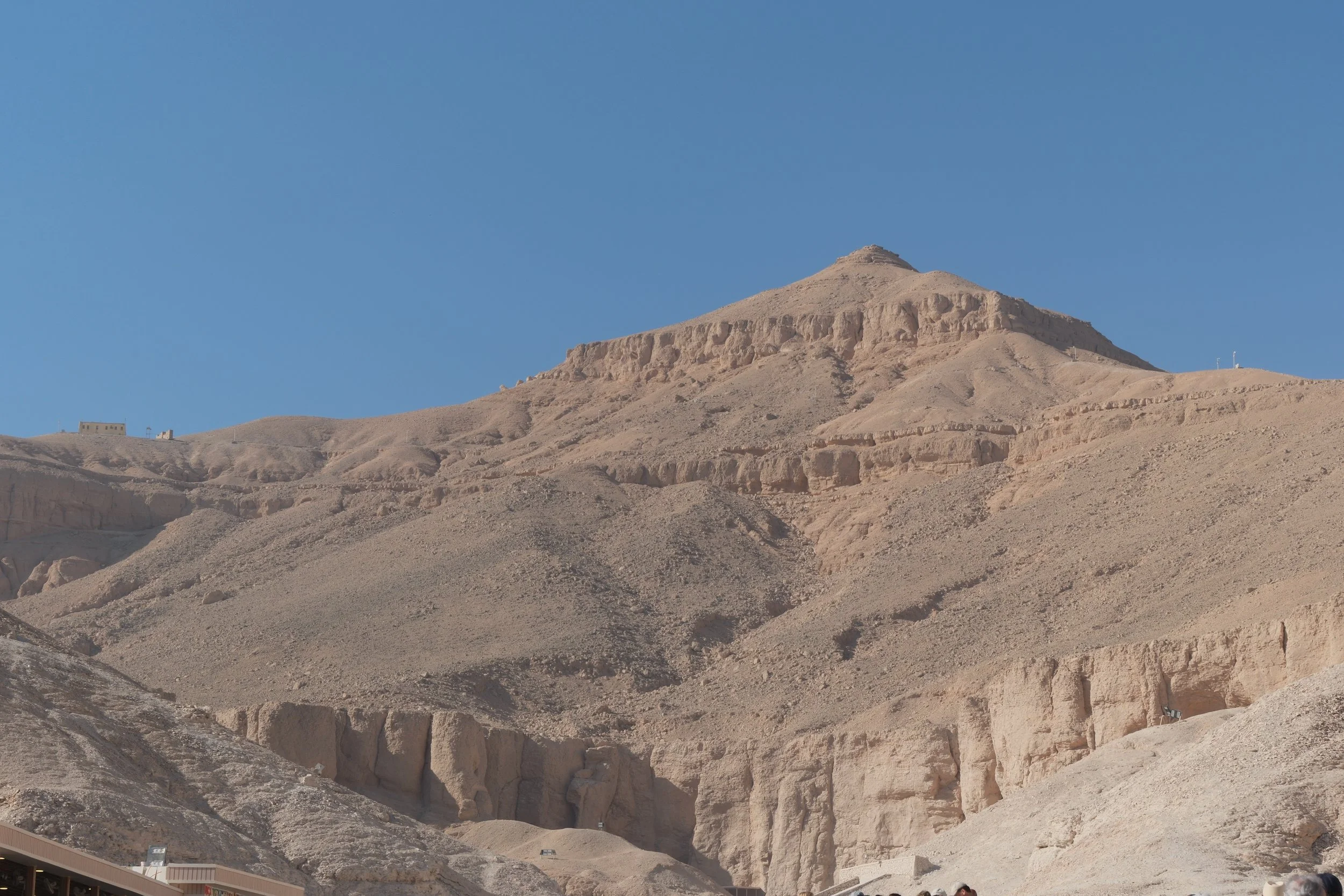 The Valley of the Kings is carved into a mountain chosen for its relative invisibility — in stark contrast to the monumental pyramids, though the mountain's pointed shape somehow recalls that same geometry. Today, the valley is marked by the incessant movement of buses and visitors, openly revealing what was once meant to be concealed and never visited.