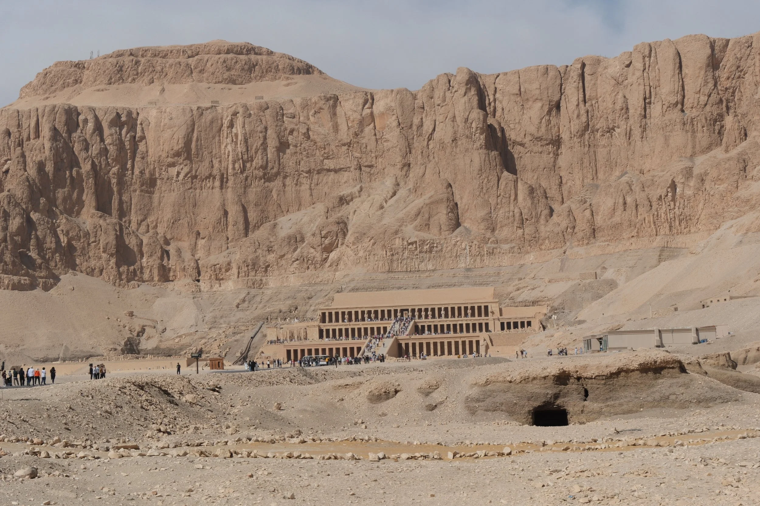She was the only woman to ever rule in a male-dominated system, and to do so, she adopted the full iconography of kingship — ritual beard, male titles, conventional representations — as a way to assert her authority, establishing it not as an exception but as a necessity within the cosmic order. Beyond her significance as a woman ruler, she was also one of the greatest pharaohs, bringing cultural and architectural innovation to ancient Egypt during her more than twenty years of reign. This is clearly visible in the design of the mortuary temple: carved into the cliffs, with precise geometric symmetry, a sequence of ascending terraces and sharp lines that blend seamlessly with the mountain behind. It feels startlingly modern.