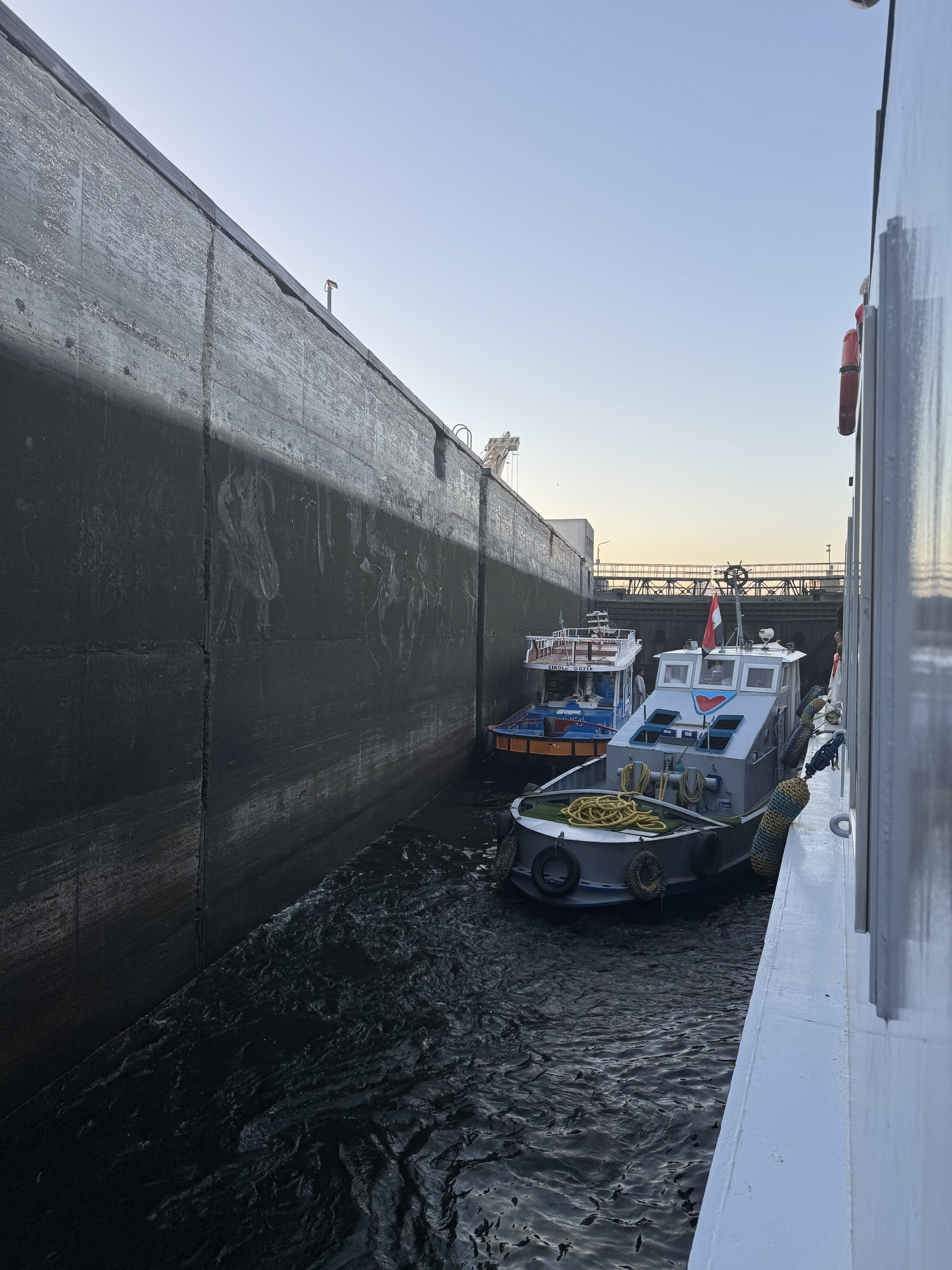 The first lesson comes early, at the crack of dawn. Sleep is interrupted by the metallic clanging and the dull percussion of the hull against a wall. The dahabiya enters the Esna lock.