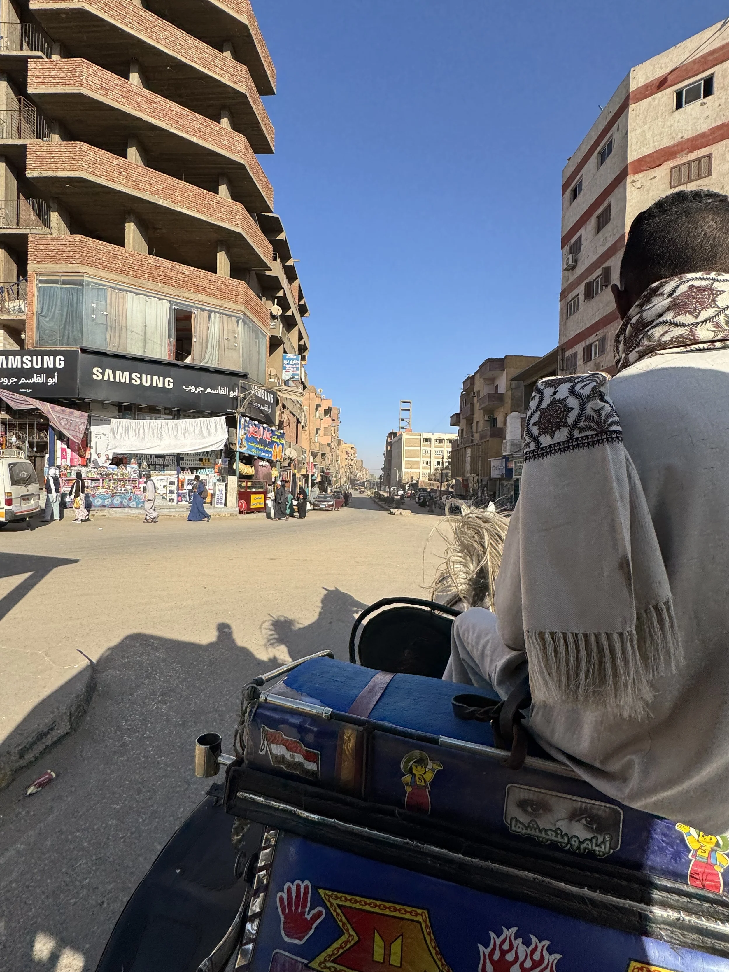 The docking is the best-maintained structure in sight; the rest of the town is in disarray. Walking the twenty minutes to the temple is highly advised against - and at first this seems odd - but already at the dock you’ll understand why. An armed guard is stationed at our dock’s entrance, a safety precaution for visitors. Outside, the acrid smell of horse manure takes over. Several patched-up horse-drawn carriages await. The horses are thin and dusty, their manes stiff. Some carriages are personalized with stickers and tags, like a race car, which is a great treasure for their riders who’ve secured a job in a difficult context.