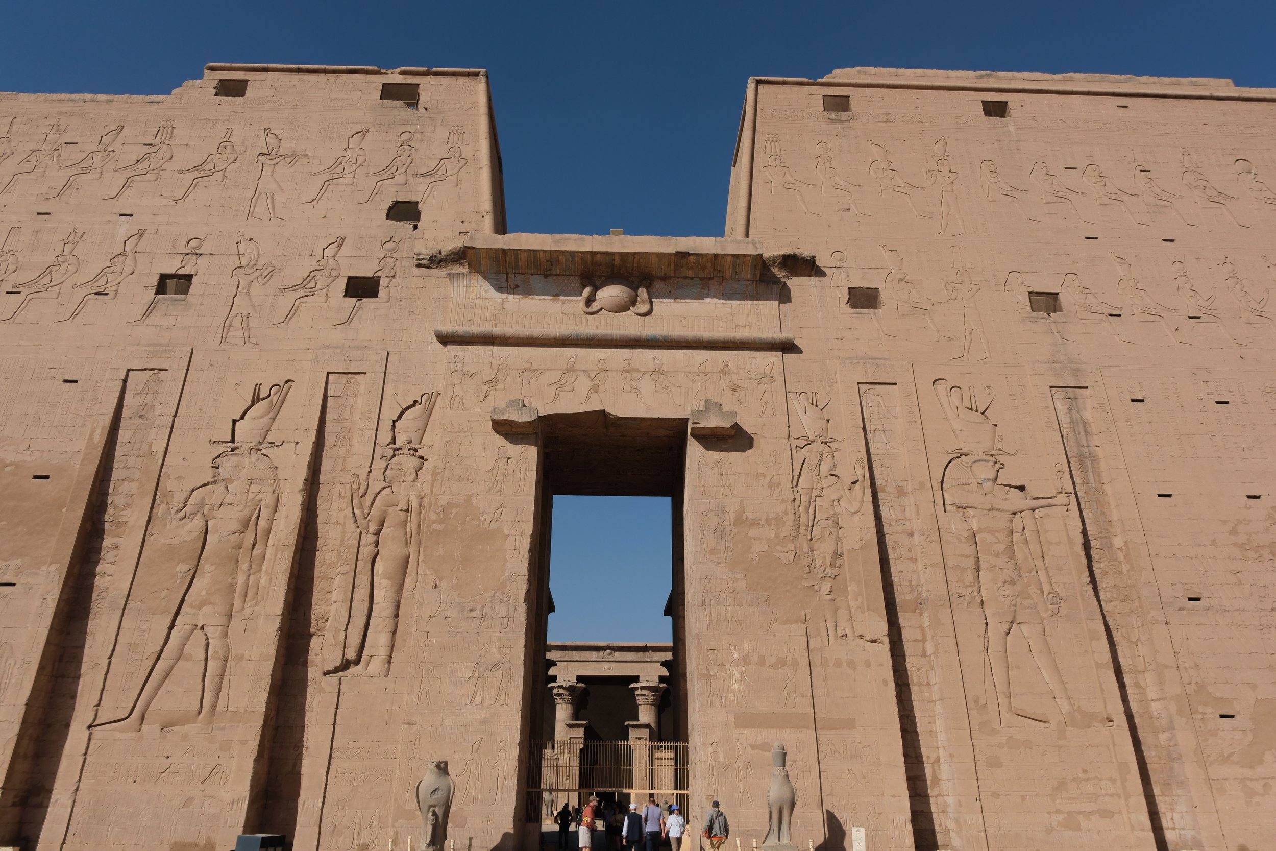 Arriving at the Temple of Horus, the structure reveals itself by towering over the protective walls. Inside the walls: two thousand years of near-perfect stone, the falcon-headed god of order gazing from every surface. Outside: a poverty so visible it seems to push back against the idea that any of this belongs to the people who live next to it. The Ptolemaic temple was built between 237 and 57 BC, recent by Egyptian standards. Dedicated to Horus, the falcon god who embodies legitimate rule and the defeat of chaos, this temple was designed to represent how order is always provisional; it must always be maintained. Horus continuously defeats Seth - chaos, dissolution, and everything that threatens the system. Power must be continuously reasserted to remain.