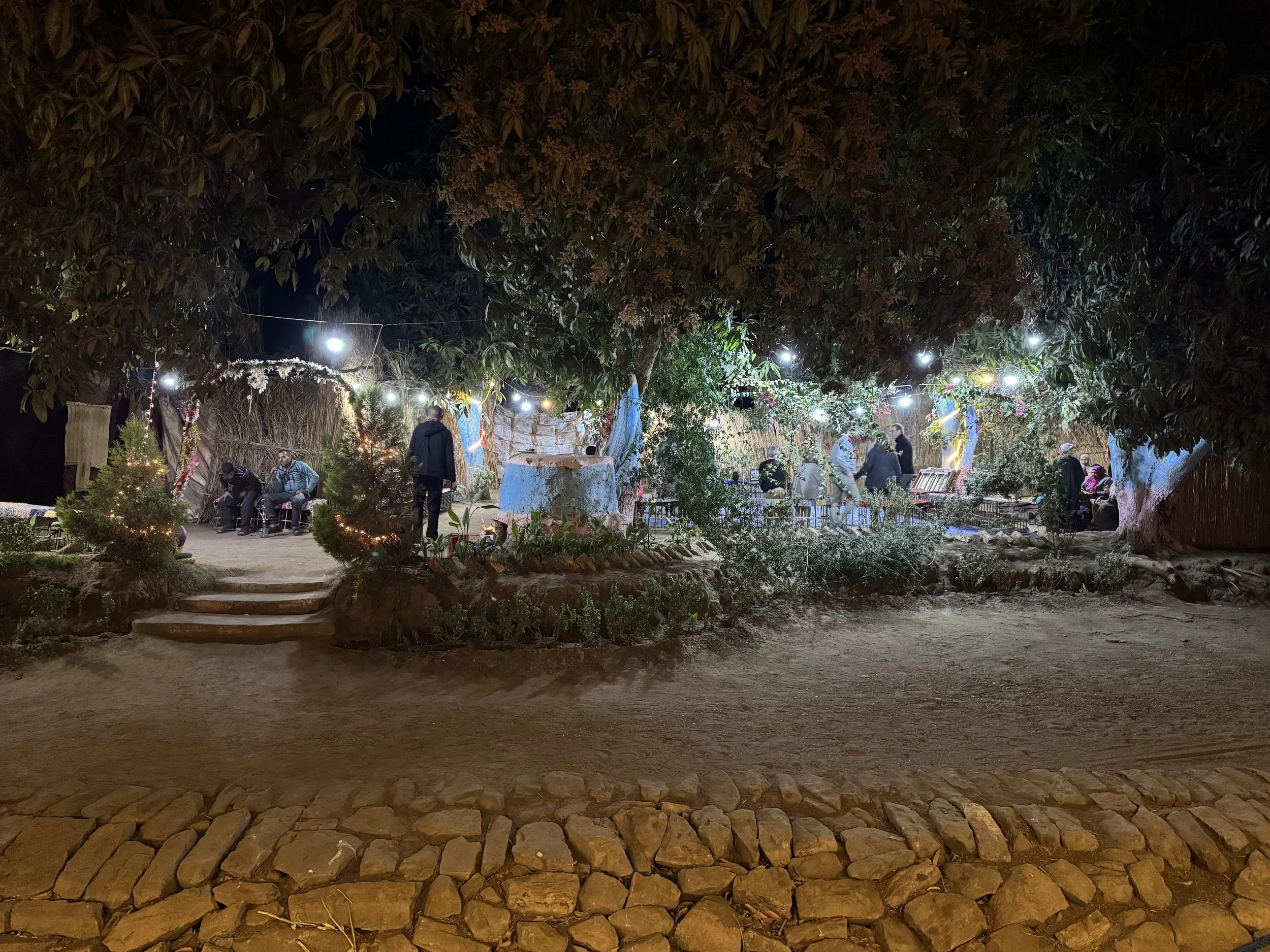 The men played. The men danced. The female and male tourists were insistently invited to join them on the makeshift floor, where the dirt is covered with a plastic tarp. The local women watched from the edges, seated, still. Nobody commented on this. It was simply how the evening was organized. Which is to say, it was organized the way public space in rural Egypt is generally organized, with the implicit understanding that certain freedoms of movement apply to some people and not others. While the awkward party unfolds, this thought sits alongside the music and the warm air and the river sounds, part of the same picture.