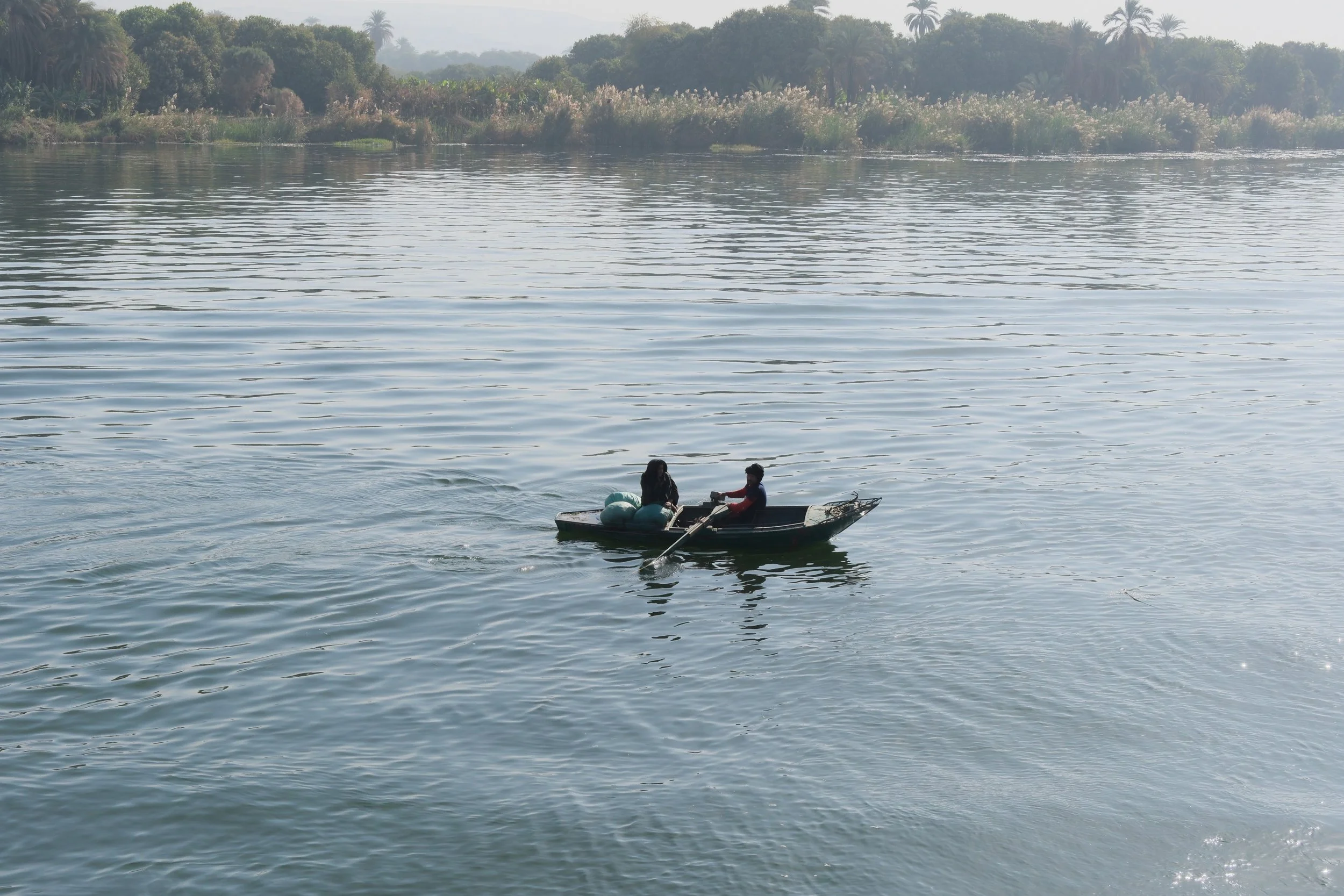 As we travelled on our dahabiya - the traditional wooden houseboat - we kept moving south at a pace dictated by the river. Mornings are for moving; afternoons for stopping; evenings for watching the sunset over the grassy banks. From your little floating village, you can observe the life around you, happening on the Nile: the fishermen, irrigation pipes, a heron gliding to stop in the marsh, a boy slapping the back of his donkey for it to move faster, agricultural workers, and the spotty grey clouds emitted by the scarce industrial presence around. There is no way to rush your way through the river; it’s an exercise in patience.